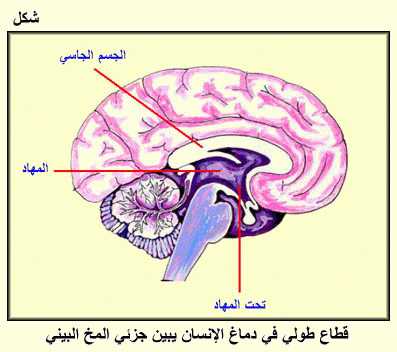 قطاع طولي في دماغ الإنسان يبين جزئي المخ البيني