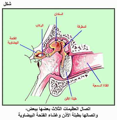 اتصال العظيمات الثلاث بعضها ببعض، واتصالها بطبلة الأذن وغشاء الفتحة البيضاوية