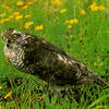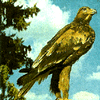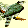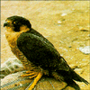 صقر يقف على يد صقَّار، وعيناه مغطيتان بالبرقع