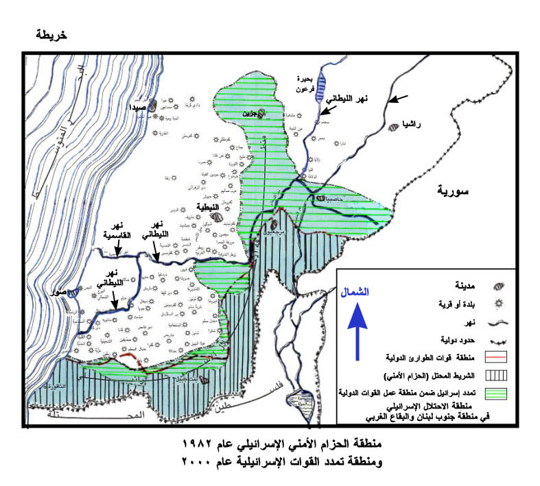 منطقة الحزام الأمني الإسرائيلي عام 1982 ومنطقة تمدد القوات الإسرائيلية عام 2000