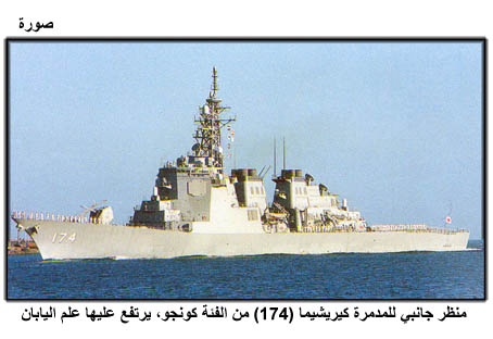 منظر جانبي للمدمرة كيريشيما (174) من الفئة كونجو، يرتفع عليها علم اليابان