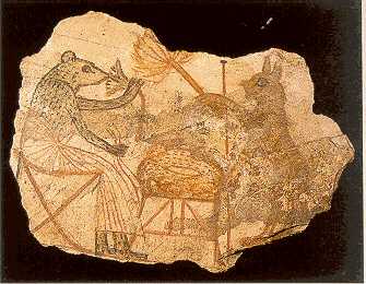 قطعة من الفخار، من دير المدينة يرجع تاريخها إلى عام 1150 قبل الميلاد (يُرى في القطعة قطة تؤدي دور خادمة، تروّح عن سيدتها، المرسومة على هيئة فأر، ممسكة بزهرة اللوتس)
