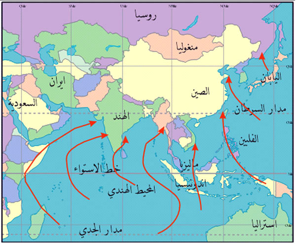 اتجاه الرياح، خلال فصل الصيف، في إقليم المناخ الموسمي، في جنوب شرقي آسيا