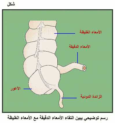 رسم توضيحي يبين التقاء الأمعاء الدقيقة مع الأمعاء الغليظة