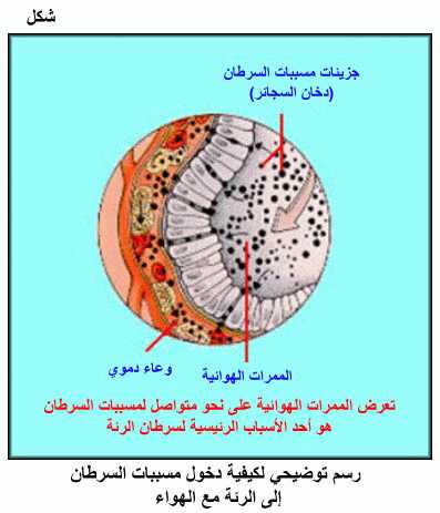 رسم توضيحي لكيفية دخول مسببات السرطان إلى الرئة مع الهواء