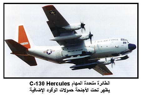 الطائرة متعددة المهام C-130 Hercules، يظهر تحت الأجنحة حمولات الوقود الإضافية
